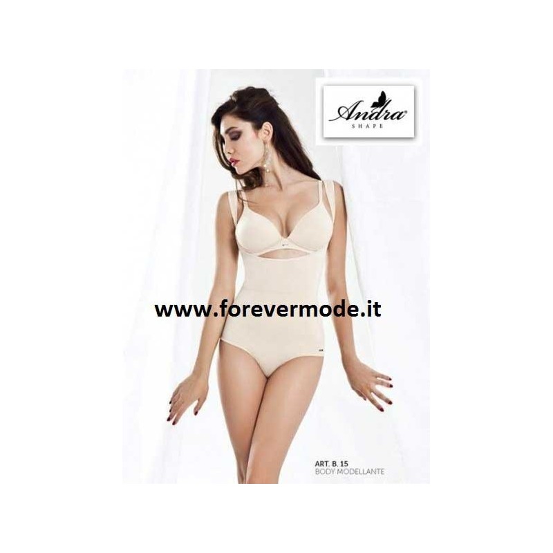 Body donna Andra Lingerie modellante in microfibra con seno aperto per un'effetto snellente. Pannello di rinforzo nella parte anteriore per un ottimale controllo della zona addominale, modella i fianchi e solleva i glutei grazie alle fasce integrate modellanti inserite nei fianchi e nel giro gamba posteriore. Spalla larga per avvolgere e modellare anche la parte superiore del busto senza lasciare intravedere eventuali cuscinetti. Scollatura con spinta laterale che enfatizza il push-up. Modello art B15. Composizione 80% poliam 20% elastan.