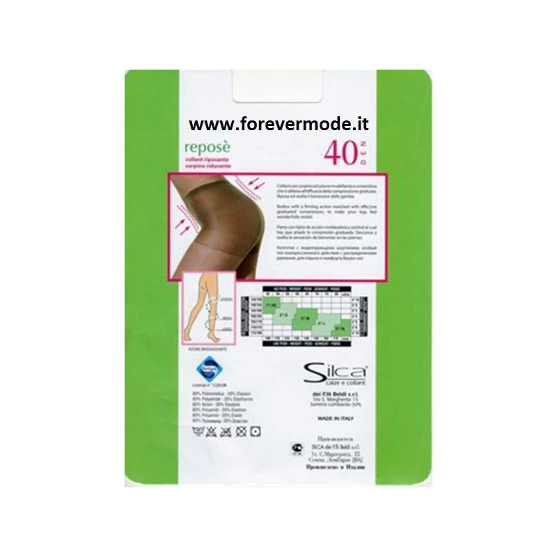 Collant donna Silca Reposè 40 denari con guaina da 70 denari, punta rinforzata e corpino ad azione modellante e contenitiva che si abbina all'efficacia della compressione graduata. Riposa ed esalta il benessere delle gambe. Su questo collant sono stati fatti trattamenti antiallergici sia al filato che al colore. Il collant, nella 5° misura è calibrato, ha la mutandina ampliata per permettere una maggiore vestibilità. Il collant con la mutandina ampliata può essere indossato al contrario in modo che la parte più larga sia davanti e comprima meno l'addome, ideale per chi ha problemi allo stomaco tipo gonfiori, interventi o altro. Composizione 80% poliam 20% elastan. Modello art Repose 40. Prima di effettuare il pagamento contattateci per taglie e misure. Contatto diretto per informazioni e richieste, Tel. 3337025836.