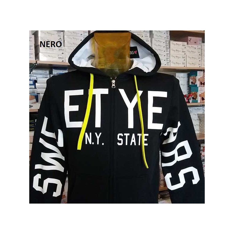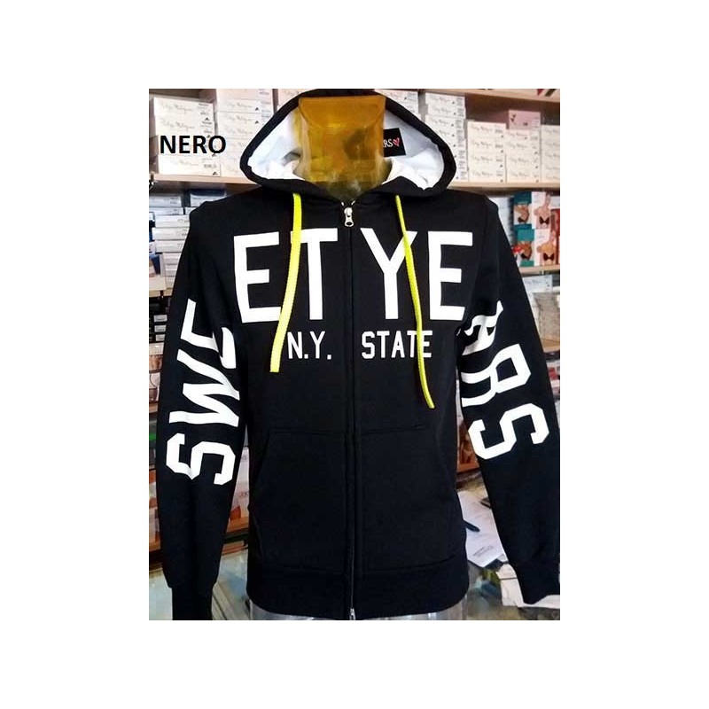 Felpa uomo Sweet Years aperta con cerniera a manica lunga con logo stampato frontale e sulle maniche, tasche e cappuccio. Dietro liscia. Tessuto garzato estivo. Composizione 100% cotone. Modello art SYU3252. Made in Italy.