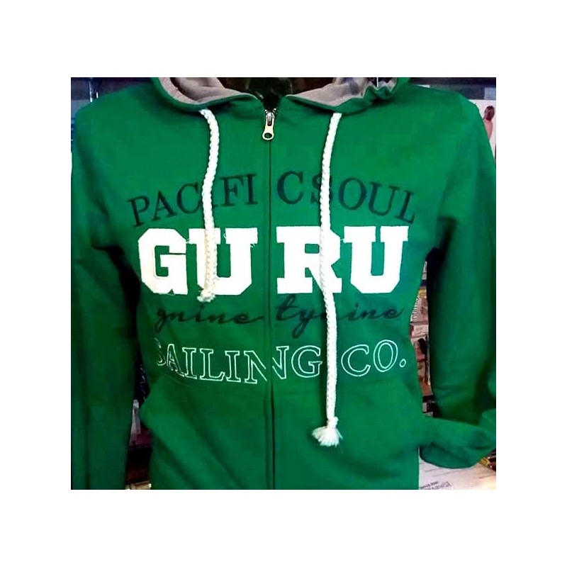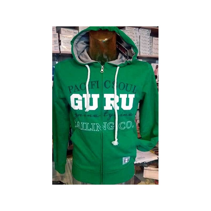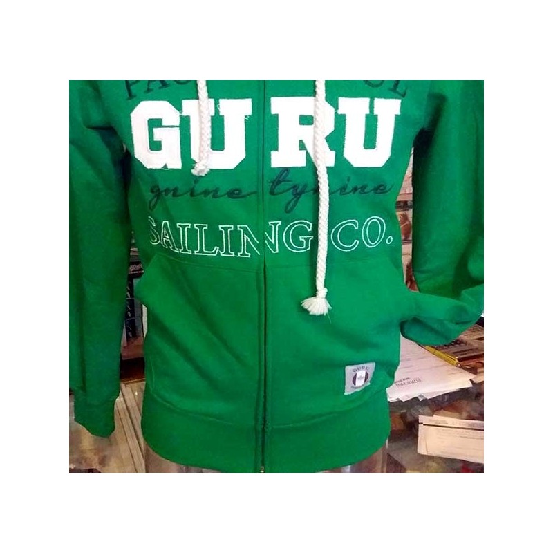 Felpa uomo Guru aperta zip con logo ricamato frontale, interno cappuccio in contrasto di colore e tasche come da foto. Tessuto garzato estivo. Dietro liscia. Composizione 100% cotone. Modello art G991056.