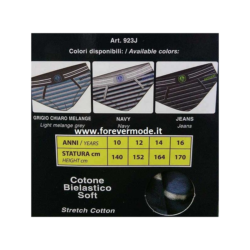 Gruppo di 6 Slip da bambino Navigare in cotone elasticizzato lavorati moda con elastico esterno loggato. Composizione 100% cotone. Modello art Moda B. Made in EU. La foto è indicativa, vi invieremo sempre un modello diverso delle nuove collezioni a seconda della nostra disponibilità a magazzino tra; rigato, scozzese, tinta unita con bande e micro fantasia. Per questo motivo non saranno accettate contestazioni a riguardo. Prima di confermare l'ordine contattateci per disponibilità taglie e colori. Contatto diretto per informazioni e richieste, Tel. 3337025836.