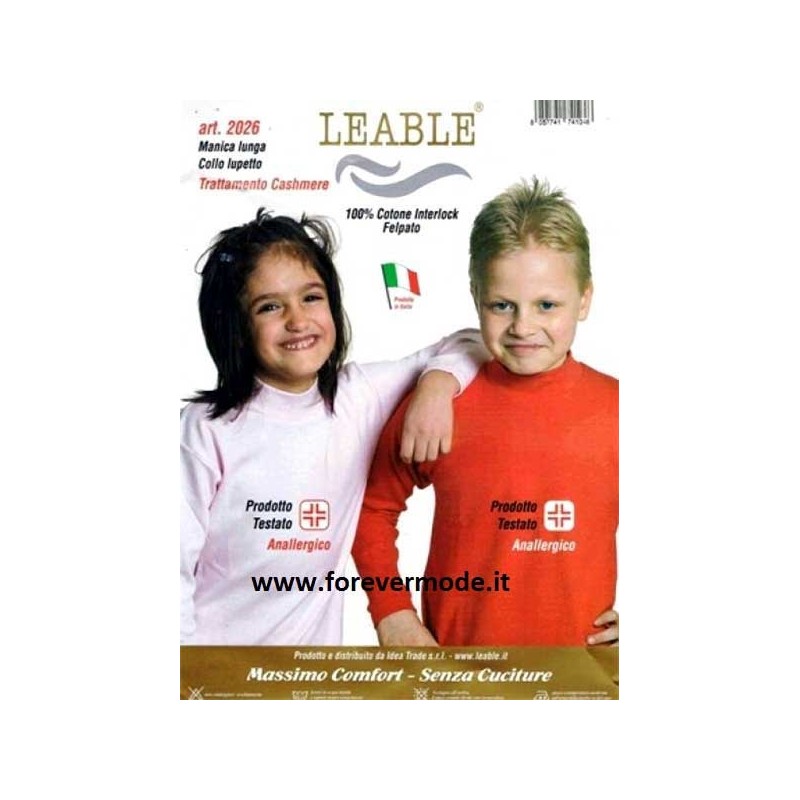 T-shirt maglia bambino Leable manica lunga a lupetto in morbido e caldo cotone felpato invernale. Composizione 100% cotone. Modello art 2026. Made in Italy.