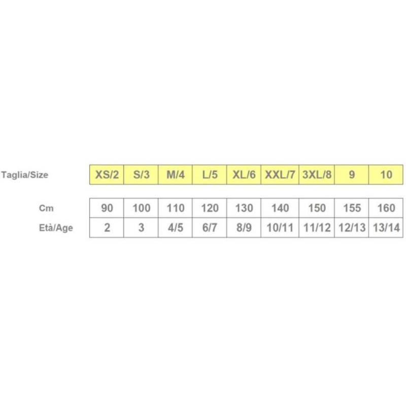 Taglie: 3 anni=98cm. 4 anni=104cm. 5 anni=110cm. 6 anni=116cm. 8 anni=128cm. 10 anni=140cm. 12 anni=150cm. 14 anni=160cm.16 anni=170cm.