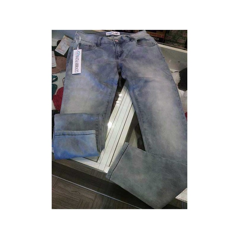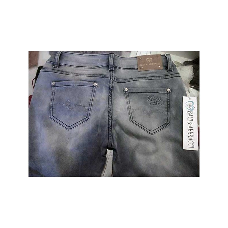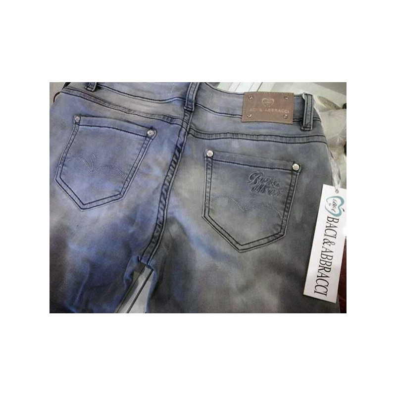 Jeans donna Baci & Abbracci in morbido cotone elasticizzato con logo ricamato sulla tasca posteriore. Tessuto con sbiaditure molto elastico e comodo a Vita bassa. Modello art EDB05. Composizione 98% cotone 2% elastan.
