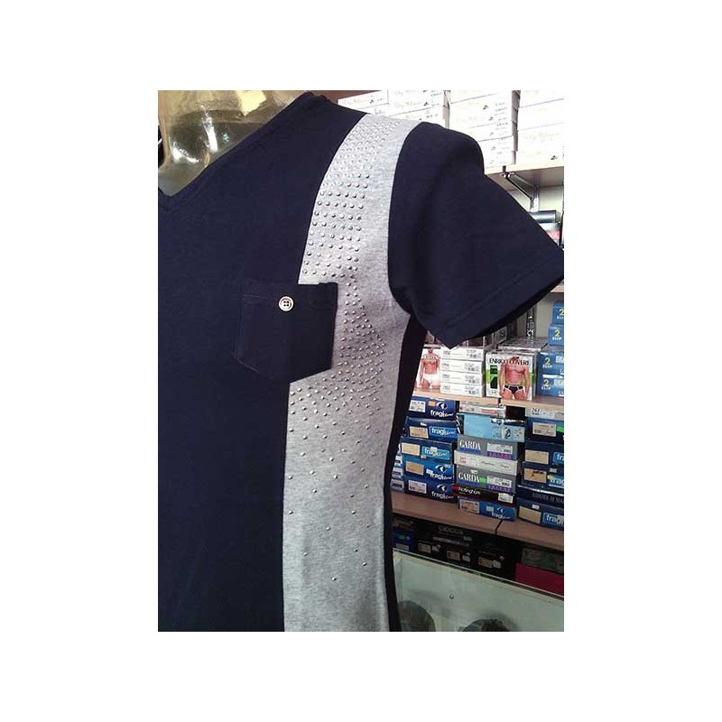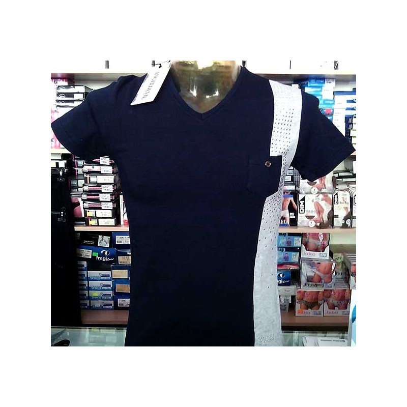 T-shirt maglia uomo Angel Devil manica corta con scollo a V in cotone elasticizzato con banda verticale, borchiette argentate e taschino. Composizione 93% cotone 7% elasten. Taglio aderente. Modello art 14010008.
