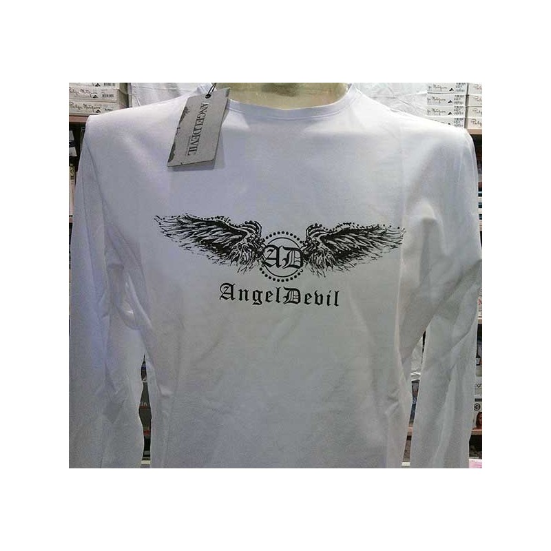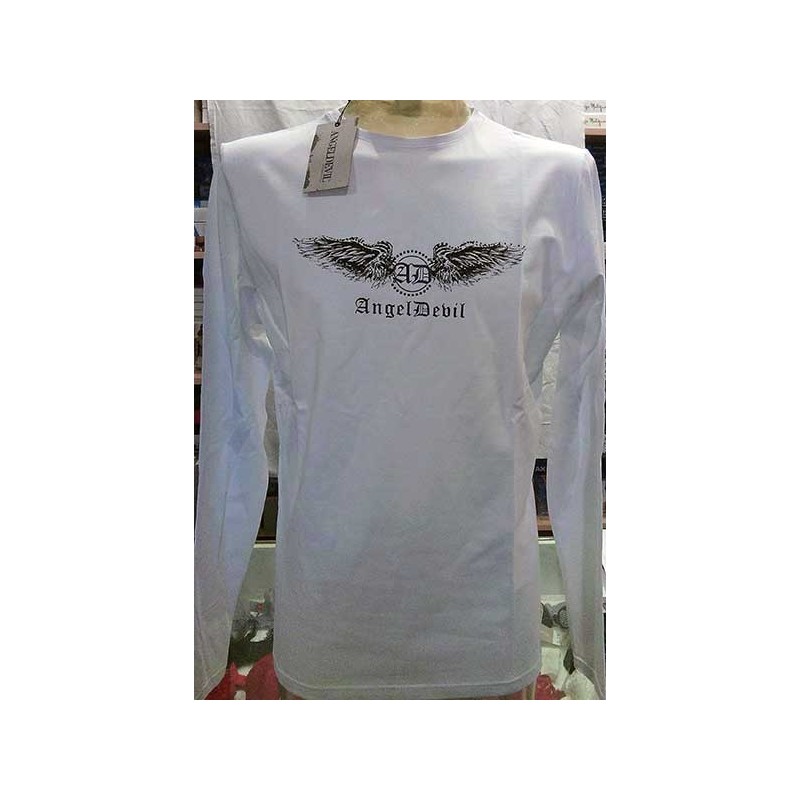 T-shirt maglia uomo Angel Devil manica lunga a girocollo in cotone elasticizzato con stampa logo argentata e borchiette. Composizione 93% cotone 7% elasten. Taglio aderente. Modello art 14010111.