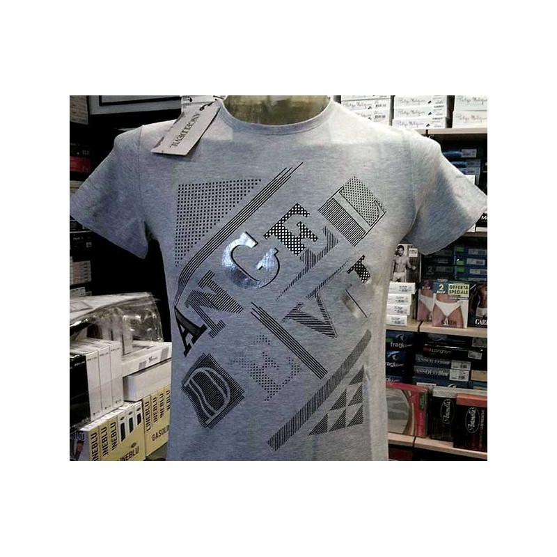 T-shirt maglia uomo Angel Devil manica corta a girocollo in cotone elasticizzato con stampa logo argentato frontale. Composizione 93% cotone 7% elasten. Taglio aderente. Modello art TU79.
