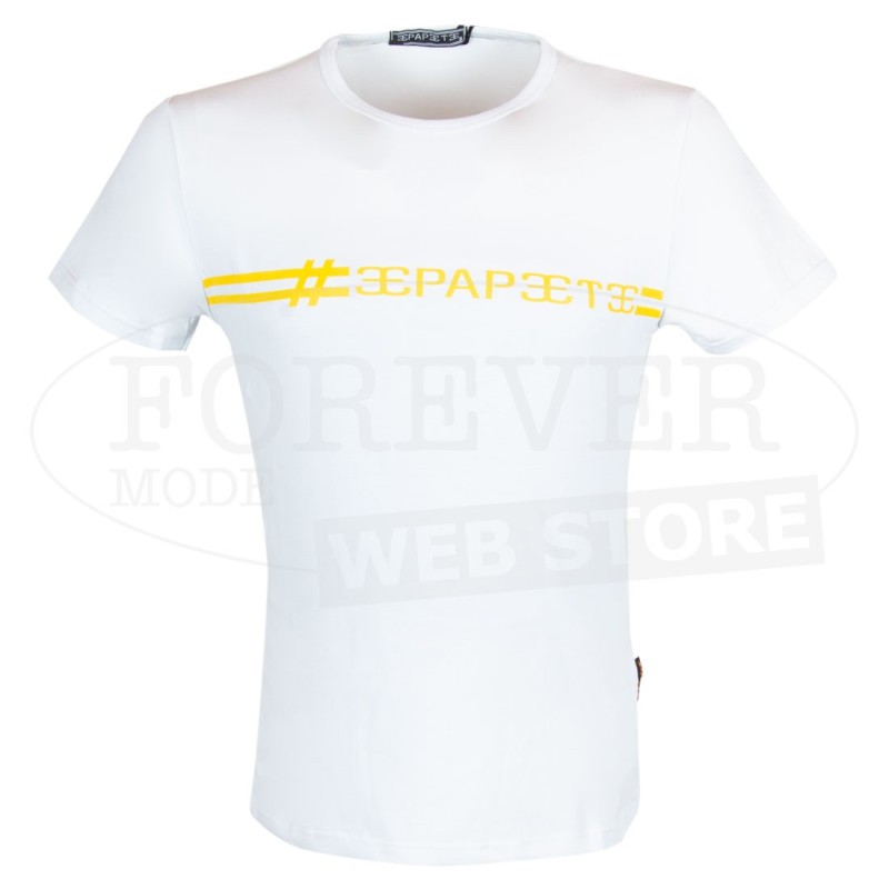 T-shirt maglia uomo Papeete manica corta a girocollo in cotone elasticizzato con stampa logo fluo. Taglio aderente. Dietro liscia. Modello art PAP4666. Composizione 92% cotone 8% elasten.